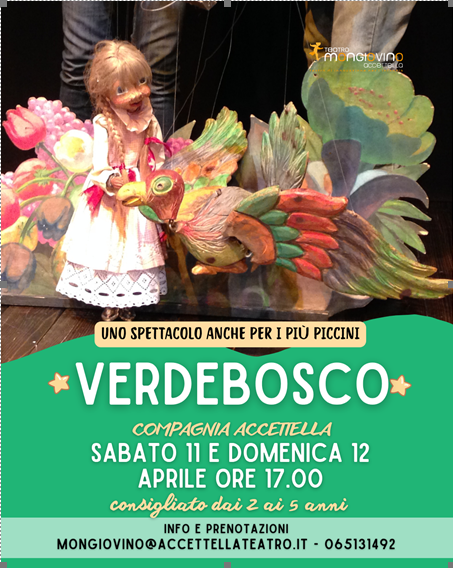 | Sabato 11 e domenica 12 aprile 2026, ore 17.00 VERDEBOSCO Teatro delle Marionette degli Accettella Il viaggio di una bambina in un bosco misterioso è la metafora di un viaggio di crescita interiore che sensibilizza il bambino al rispetto degli altri ma anche allo sviluppo di spirito critico e di osservazione. Riuscirà Arianna a ritrovare la strada di casa? Ideazione, drammaturgia e regia: Alessandro Accettella e Arianna Fioravanti Con: Alessandro Accettella e Viviana Mancini Marionette e maschere: Ferdinando Codognotto, Roberta Socci, Brina Babini Luci: Italo Friggerio Tecnica: Teatro di marionette e teatro d’attore Età consigliata dai 2 ai 5 anni |